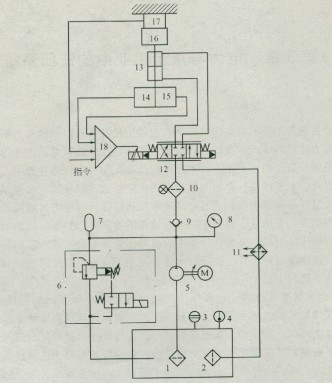 圖2-47所示為電液伺服控制系統(tǒng)的液壓原理圖。系統(tǒng)的油源為CY—C系列電機(jī)組合泵5,泵的工作壓力和卸荷由電磁溢流閥6設(shè)定和控制,壓力由壓力表8顯示。系統(tǒng)的執(zhí)行器為液壓缸13,通過電液伺服閥12的控制,液壓缸的活塞桿按要求方向和速度運(yùn)動(dòng)并帶動(dòng)減振器1 6運(yùn)動(dòng);伺服闊12前設(shè)有帶污染指示的精過濾器10。系統(tǒng)還設(shè)有液位計(jì)3、溫度調(diào)節(jié)器4、吸油和同油過濾器1及2、蓄能器7等輔助元件。該系統(tǒng)與微機(jī)測(cè)控系統(tǒng)一起對(duì)試驗(yàn)臺(tái)進(jìn)行閉環(huán)反饋控制。
