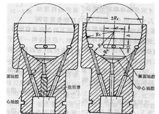 圖1為兩種球塞式內(nèi)曲線液壓馬達(dá)的球塞副,它由一個(gè)階梯柱塞和一個(gè)容納于柱塞大端的鋼球組成。柱塞大、小端直徑之比約為√2。導(dǎo)軌曲面最好能做成適于鋼球滾動(dòng)的滾道槽。鋼球之所以較大,是為了降低導(dǎo)軌曲面的接觸應(yīng)力和柱塞球窩處的比壓。切向力由鋼球經(jīng)柱塞大端傳給缸體,所以球塞馬達(dá)也屬于柱塞傳力類型。