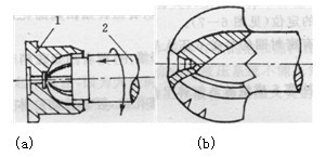 圖2(a)為球形鉸刀鉸削球窩的情形。鉸刀(圖5(b》的切削部分如同一個(gè)半圓球頭,上面開(kāi)有四至六個(gè)刀齒。刀齒的前角為零,后角靠手工操作在工具磨床上沿圓弧刃的后刀面修磨出來(lái)。為了保持刀形的正確,沿刀刃后面留有0.2 -0.3mm的刃帶,此刃帶在鉸削時(shí)還對(duì)工件內(nèi)球面有修光作用。球鉸刀有粗、精之分,粗鉸刀刀齒上開(kāi)有分屑槽,精鉸刀則沒(méi)有。加工時(shí),一般都先用鉆頭在工件上鉆出盲孔,再用成形車刀粗車成形,然后粗鉸、精鉸。精鉸時(shí)切削速度比粗鉸圓柱孔時(shí)的切削速度要低。一般v=5~6m/min。鋼件加工時(shí)表面粗糙度為Ra1.6μm。