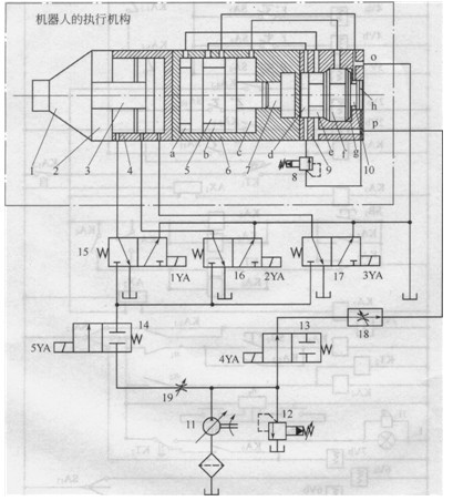 當(dāng)機(jī)器人直線前進(jìn)時(shí),電磁鐵4YA、5YA均通電使換向閥13、14均切換至左位,液壓泵的壓力油同時(shí)進(jìn)入沖擊和轉(zhuǎn)向兩個(gè)回路,使機(jī)器人的執(zhí)行機(jī)構(gòu)同時(shí)實(shí)現(xiàn)沖擊和旋轉(zhuǎn)運(yùn)動(dòng)。
