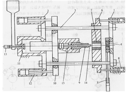 擠壓機的結(jié)構(gòu)示意圖如圖1所示。前梁1、后梁2及張力柱3組成封閉框架。前粱上安置擠壓模4,擠壓模的移動和更換由移模缸5驅(qū)動。擠壓模定位后,固定在穿孔粱6卜的擠壓簡7與擠壓模閉合形成擠壓腔,被擠壓的金屬鑄錠放置在此腔中以待擠壓,穿孔粱由擠壓筒缸8驅(qū)動。擠壓桿9裝于活動梁10上,活動梁10的驅(qū)動是由主缸11和側(cè)缸12共同完成的,側(cè)缸可以完成快速進、退動作,主缸完成擠壓動作,當擠壓桿接近擠壓筒后,慢速將金屬由擠壓模孔中擠出,成為一定斷面型的型材或管材。主缸的充液和卸壓由于充液閥缸13驅(qū)動充液閥完成。擠壓管材或有孔的封閉斷面的型材時,需用穿孔針14,由穿孔缸15驅(qū)動,穿孔針可在擠壓桿的的內(nèi)部移動。擠壓機在工作循環(huán)中需要頻繁地變化速度。特別是擠壓桿在擠壓的過程中,對于不同的被加工金屬,在不同的擠壓階段需要有不同的擠壓速度。此外,穿孔針的移動、擠壓缸的移動也需要進行速度控制。