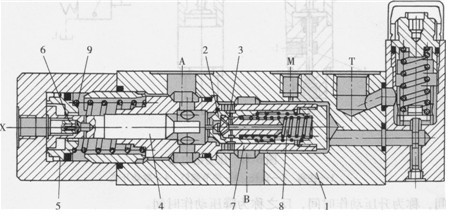 圖6-33所示為在工程機(jī)械領(lǐng)域得到廣泛應(yīng)用的一種平衡閥結(jié)構(gòu)。重物下降時的油流方向為B-÷A,X為控制油口。當(dāng)沒有輸入控制油時,由重物形成的壓力油作用在錐閥2上,B口與A口不通,重物被鎖定。當(dāng)輸入控制油時,推動活塞4右移,先頂開錐閥2內(nèi)部的先導(dǎo)錐閥3。由于閥3右移,切斷了彈簧8所在容腔與B口高壓腔的通路,該腔快速卸壓。此時,B口還未與A口溝通。當(dāng)活塞4右移至其右端面與錐閥2端面接觸時,其左端圓盤正好與活塞附件5接觸形成一個組件,并在控制油作用下壓縮彈簧9繼續(xù)右移,打開錐閥2,B口與A口相通,其通流截面依靠閥套7上幾排小孔來逐漸增大,從而起到了很好的平衡阻尼作用?;钊?左端中心部分還配置了一套阻尼組件6。這樣,平衡閥在反向通油時就比較平穩(wěn)。