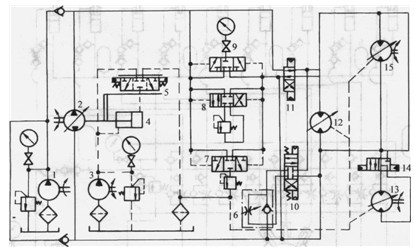 10、11-氣動(dòng)換向閥12、13、15 -變量液壓馬達(dá)14-液壓閥