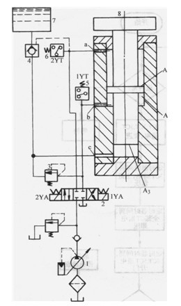 該系統(tǒng)的工作原理為:三位四通電磁閥2右位時,壓力油從液壓缸8的b口進入A2腔完成快進,這時高位油箱7的油經充液閥4從液壓缸8的c口進入A3腔向液壓缸補油,當壓力達到順序閥3設定值時,壓力油通過閥3進入b口同時對缸供油,并關閉閥4,這時缸的有效作用面積增大為A2+A3,對物料進行加壓。當壓力達到繼電器5設定值(既保壓值)時,保壓開始(1YT發(fā)信給時間繼電器)。保壓完畢時由繼電器發(fā)信使三位四通換向閥2換向至左位,壓力油從a口進入液壓缸8Ai腔并打開充液閥4使A2及A3腔油分別流回油箱及高位油箱,由此完成快退?;氐皆缓螅瑝毫_到繼電器6設定值時,2YT發(fā)信停泵、裝料,準備進入下一循環(huán)。