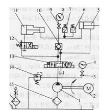 1液壓泵2一電動(dòng)機(jī)3、9壓力表開(kāi)關(guān)4、8-壓力計(jì)5一工作缸