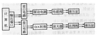 林木球果采集機(jī)器人屬示教再現(xiàn)型機(jī)器人。它的移動機(jī)構(gòu)采用J-50拖拉機(jī)。它的機(jī)械手為5個自由度全液壓驅(qū)動的機(jī)械手,由計(jì)算機(jī)與電液比例調(diào)速閥進(jìn)行電液比例控制。機(jī)械手電液比例控制系統(tǒng)工作原理如圖4.2-8所示。