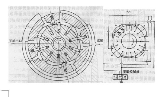 低速大扭矩葉片馬達(dá)還可以由控制閥操縱實現(xiàn)三級變排量切換,其原理如圖9-6所示。四段曲線凸起中,a、c凸起的升程較大,b、d凸起的升程較小。設(shè)b、d曲線升程是a、c升程的1/2。當(dāng)變量控制閥如圖9-6處于中位時,四個工作腔室同時進入壓力油,馬達(dá)以全排量工作,轉(zhuǎn)速最低,扭矩最大。當(dāng)變量控制閥以右位工作時,壓力油只進入口、c兩工作腔室,而b、d腔室連通油箱,沒有壓力,這時馬達(dá)有效排量是全排量的2/3,扭矩是最大扭矩的2/3,而轉(zhuǎn)速則是低檔轉(zhuǎn)速的1.5倍。當(dāng)變量控制閥以左位工作時,壓力油只進入b、d兩工作腔室,a、c腔室連通油箱,馬達(dá)以全排量的1/3工作,扭矩是最大扭矩的1/3,而轉(zhuǎn)速是低檔轉(zhuǎn)速的三倍,實現(xiàn)高速檔。因此,在工作壓差和輸入流量不變的情況下,可以獲得三檔不同轉(zhuǎn)速和扭矩的變換。如果兩組曲線升程的比例取得不同,各檔轉(zhuǎn)速和扭矩的比例也不同。若所有曲線凸起的升程都相同,則只能組合出兩檔轉(zhuǎn)速和扭矩變換。