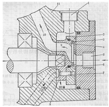 1-回油孔;2-壓力盤(pán);3一片彈簧;4-配流盤(pán);5-進(jìn)油孔;6-0型密封圈 7-定位銷(xiāo);8-配流盤(pán)的缺口;9、10 -流道;11 -殼體(缸體);12-端蓋