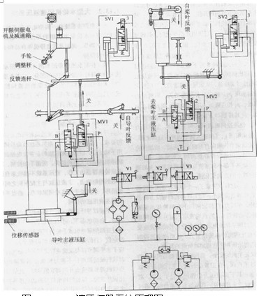 液壓控制系統(tǒng)原理圖如圖1所示。該系統(tǒng)可分為導(dǎo)葉和槳葉控制兩部分。二者在原理及結(jié)構(gòu)上大體相同,均由電液伺服加機液伺服系統(tǒng)組成。只是導(dǎo)葉伺服系統(tǒng)部分設(shè)置了餐急停機功能。