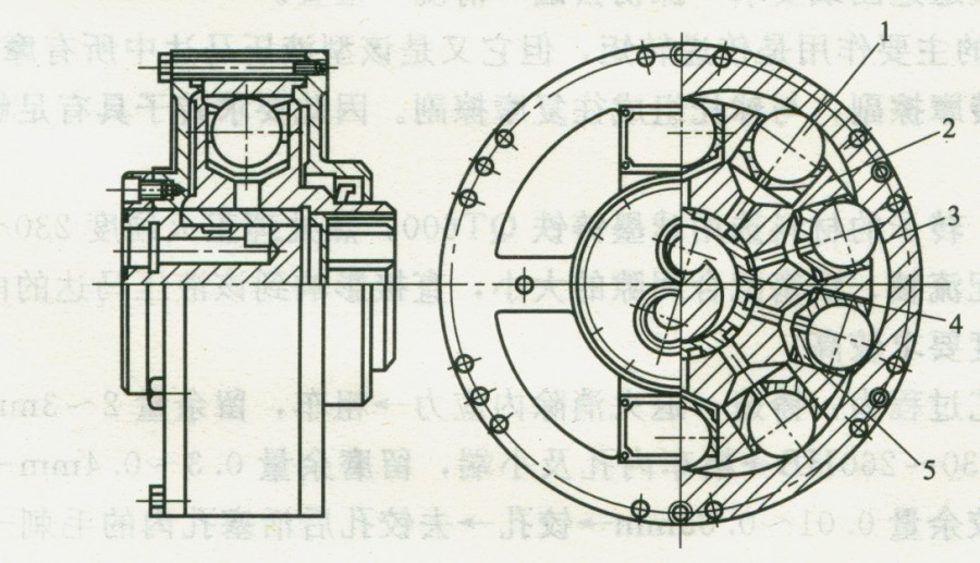 1-內(nèi)曲線定子;2-鋼球;3-球托;4-轉(zhuǎn)子;5-配流軸 定子、轉(zhuǎn)子及配流軸等主要關(guān)鍵零件的材料及工藝直接影響該型馬達的性能和壽命。