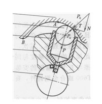 ①定子 如圖2所示,液壓馬達工作時,高壓油經(jīng)配流軸進入鋼球下端油腔,壓力油形成液壓力P,將鋼球向上推,使它與內(nèi)曲線體的曲線接觸。在接觸點處,由力P形成的分力P。壓向內(nèi)曲線定子,它就給鋼球一個大小相等、方向相反的正壓力Pc,此力作用在鋼球上可分解為徑向分力N和切向分力T,其中徑向分力N與液壓力P相平衡,切向分力T通過鋼球作用在轉(zhuǎn)子4的切線方向,迫使轉(zhuǎn)子4沿逆時針方向轉(zhuǎn)動,轉(zhuǎn)子4直接與傳動軸相連,故使傳動軸轉(zhuǎn)動。由此可見,切向分力T的大小由定子內(nèi)曲線的形狀決定。而且由于鋼球與定子的接觸應(yīng)力要比一般的滾柱或橫梁與定子的接觸應(yīng)力大得多,故要求定子不但要有準(zhǔn)確的內(nèi)曲線形狀,而且必須具備高硬度、高耐磨、抗疲勞等性能。