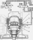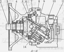 1-制動彈簧;2-驅(qū)動軸;3-隔環(huán);4,8-殼體;5-摩擦盤;6-摩擦片;7-制動活塞;9-活塞;10 -油缸體;11-配流盤;12-回轉(zhuǎn)晃動防止閥;13-中心軸;14 -中心彈簧;15 -安全閥;16 -單向閥;17 -單向閥彈簧}18-梭閥;19 -梭閥彈簧