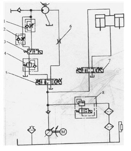1-單向調(diào)速閥2一單向節(jié)流閥3一電磁換向閥4-減壓閥5、7-電磁換向閥6-節(jié)流閥8-電磁溢流閥