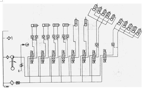 四個主缸垂直支撐著整體模板,為了使主缸能在任意位置停止并防止其由于自重自行下落,在四個主缸的進(jìn)回油路上串接液控單向閥(液壓鎖)。主缸的控制閥選用“Y”型中位機(jī)能的控制閥,中位時,A.B兩油口直接通油箱,液控單向閥立即關(guān)閉,活塞停止運(yùn)動,實(shí)現(xiàn)了主缸的可靠定位。