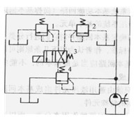 2)通過(guò)換向閥換接遠(yuǎn)程調(diào)壓閥來(lái)控制主溢流閥的壓力 能變換的壓力級(jí)數(shù)與遠(yuǎn)程調(diào)壓閥的數(shù)量相同。如圖3 .1-4所示。閥4是主溢流閥,閥3可變換不同的遠(yuǎn)調(diào)壓閥1,2以改變系統(tǒng)的壓力。