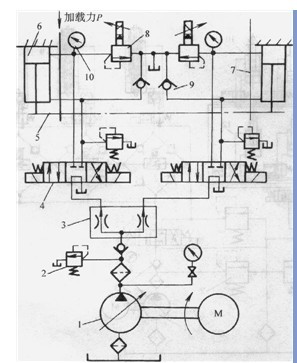 1液壓泵2溢流閥3一分流閥4換向閥5-連接件6-加載缸