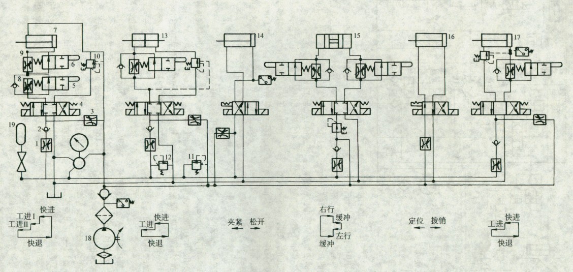 在圖1中,液壓缸7,液壓缸13和液壓缸17分別控制三個(gè)滑臺(tái)。液壓缸14為夾緊缸,液壓缸15為輸送工件液壓缸,液壓缸l6為定位缸。由三位四通或二位四通換向閥分別控制各液壓缸的往復(fù)運(yùn)動(dòng)。在油路中可以不接人調(diào)速閥,可以接入一個(gè)調(diào)速閥(如液壓缸13,液壓缸17的油路),也可接人兩個(gè)串聯(lián)的調(diào)速閥(如液壓缸7、液壓缸15的油路),用這種方法使液壓缸7、液壓缸13、液壓缸17進(jìn)行速度換接完成快進(jìn)、工進(jìn)I和工進(jìn)Ⅱ等動(dòng)作,同時(shí)還可使液壓缸15在每個(gè)方向上完成常速和緩沖的速度換接。