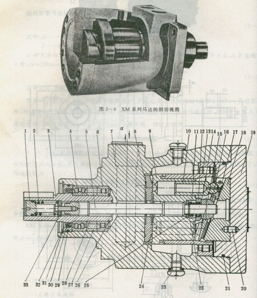 軸套3由雙列調(diào)心軸承4,滾子軸承6,內(nèi)、外隔圈28.27和卡環(huán)26聯(lián)結(jié)成一體,被支承于馬達(dá)殼體7內(nèi),并由油封壓蓋30、孔用卡環(huán)32軸向定位。這種傳動(dòng)軸與軸套組合式的結(jié)構(gòu),使得外負(fù)載對(duì)軸套3可能產(chǎn)生的橫向力矩由軸承和殼體來承擔(dān),而不會(huì)傳遞給軸5,故不致影響泵內(nèi)缸體9等精密零件的運(yùn)轉(zhuǎn)。