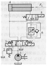 1-液壓泵2-溢流閥3-三位四通電磁換向閥4-液壓缸5-=位三通電磁換向閥 6-單向調(diào)速閥