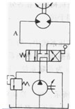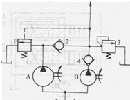 在組合機(jī)床、半自動車床等單回路系統(tǒng)中,有時(shí)也采用雙泵。輕載快進(jìn)時(shí),兩泵合流供油,如圖1. 3-8所示。重載慢進(jìn)時(shí)卸荷閥1打開低壓大流量泵A卸荷,高壓小流量泵B單獨(dú)向系統(tǒng)供油,以節(jié)省功率降低溫升。有些油壓機(jī)、注塑機(jī)等也要求快慢速比大,并有一段保壓時(shí)間,則也用雙泵系統(tǒng),在快速時(shí)雙泵供油,慢速及保壓時(shí)單個小泵供油,以減少功率消耗和溫升。