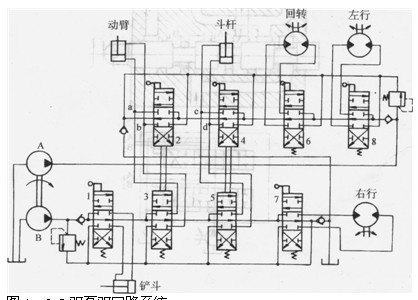 圖1.3-9為采用雙泵的挖掘機(jī)液壓系統(tǒng)簡圖。圖中泵A向動臂液壓缸、斗桿液壓缸、回轉(zhuǎn)馬達(dá)及左行馬達(dá)供油,組成一獨(dú)聯(lián)回路;泵B向鏟斗液壓缸、動臂液壓缸、斗桿液壓缸及右行馬達(dá)供油,組成另一獨(dú)聯(lián)回路,故為雙回路系統(tǒng)。這兩回路本身及兩回路之間都不互相干擾,從而使分屬于這兩回路中的任意兩機(jī)構(gòu)在輕載及重載時(shí)都能實(shí)現(xiàn)無干擾的同時(shí)動作,提高挖掘機(jī)的生產(chǎn)率和發(fā)動機(jī)的效率。
