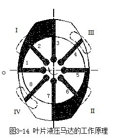 兩側(cè)受同樣大小的壓力,不產(chǎn)生轉(zhuǎn)矩。處在工作段的葉片3、7和1、5,一側(cè)受高壓而另一側(cè)受低壓作用,葉片3伸出的面積大于葉片1伸出的面積,葉片7伸出的面積大于葉片5伸出的面積。產(chǎn)生順時針方向的轉(zhuǎn)矩,使轉(zhuǎn)子軸克服外載荷轉(zhuǎn)矩而旋轉(zhuǎn),輸出機械能。因此同樣的,當Ⅲ、Ⅳ進油,I、II回油時,葉片液壓馬達產(chǎn)生逆時針方向的轉(zhuǎn)矩。這就是葉片液壓馬達的工作原理。