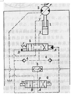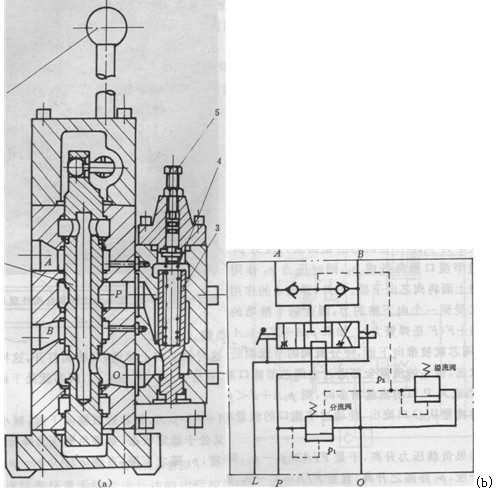 從進油口P流人的流體,通過主閥芯2的節(jié)流口通向負載(A口或B口)的同時,分流閥閥芯3的下面也得到一個將閥芯向上推動的力,這個力的大小為p1A(A是閥芯的截面積),壓力p1由于通過節(jié)流口而降低成p2,同時壓力p2作用于閥芯的上面將閥芯向下推。另外,彈簧4的作用使閥芯又受到一個向下推的力,因此向下推動的力為p2A+F(F是彈簧力)。如果p2A+F>p1A成立,則閥芯就被推向下面,使分流閥的節(jié)流面處于封閉狀態(tài),流入的流量全部通過主閥芯節(jié)流口通向負載。