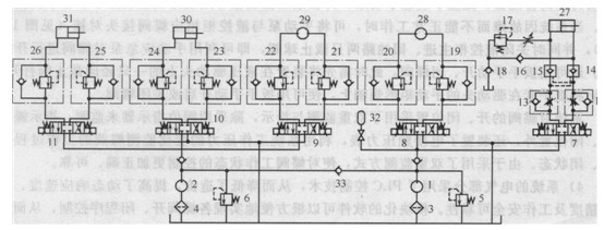 1、2-液壓泵;3、4-過濾器;5、6-溢流閥;7~11電液比例閥;12、13節(jié)流閥; 14、15 -液控單向閥;16、18、33-單向閥;17 -溢流閥;19~26-平衡閥;27-補(bǔ)償液壓缸;28回轉(zhuǎn)液壓馬達(dá);29-起升絞車液壓馬達(dá);30-主臂液壓缸;31-副臂液壓缸;32-蓄能器