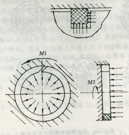 馬達運轉(zhuǎn)時,應(yīng)使密封環(huán)壓在孔壁上不動,運轉(zhuǎn)時,旋轉(zhuǎn)運動副當(dāng)發(fā)生在配流軸的環(huán)槽側(cè)壁與相對密封環(huán)的側(cè)面上。若密封環(huán)隨配流軸轉(zhuǎn)動,則配流缸壁很快會磨出凹槽而破壞密封作用,因此,在設(shè)計時要根據(jù)M1>M2的要求確定密封環(huán)的內(nèi)半徑r1,并校核環(huán)內(nèi)側(cè)壁與密封環(huán)的接觸比壓。 密封環(huán)兩側(cè)面平行度之差為0.O1mm,端面與內(nèi)、外圓柱面垂直度允差為0.O1mm。