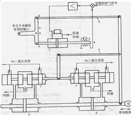 典型電液復(fù)合舵機(jī)系統(tǒng)原理如幽4.20-5所示,它的輸入來自手動(dòng)操縱裝置和來自自動(dòng)操縱裝置的電信號(hào)。自動(dòng)操縱裝置是由電液伺服閥、伺服放大器、伺服液壓缸、位移傳感器所組成的位置伺服閉環(huán)回路,使自動(dòng)操縱裝置的位移(即伺服液壓缸位移)與輸入電信號(hào)成比例。舵機(jī)的輸出是負(fù)載液壓缸活塞桿的位移,此位移通過連桿機(jī)構(gòu)帶動(dòng)舵面偏轉(zhuǎn),來自手動(dòng)操縱裝置或自動(dòng)操縱裝置的輸入信號(hào)經(jīng)連桿帶動(dòng)串聯(lián)控制閥運(yùn)動(dòng),串聯(lián)閥的左右位移即控制了液壓油進(jìn)入串聯(lián)液壓缸的方向和流量,于是活塞桿帶動(dòng)舵面動(dòng)作,其運(yùn)動(dòng)又通過反饋桿反饋到串聯(lián)閥,當(dāng)串聯(lián)閥恢復(fù)原始位置時(shí)油路切斷,使串聯(lián)液壓缸停止運(yùn)動(dòng)。兩套液壓系統(tǒng)的液壓源分別由不同的發(fā)動(dòng)機(jī)驅(qū)動(dòng),所以即使一個(gè)系統(tǒng)出現(xiàn)故障另一個(gè)系統(tǒng)也不會(huì)受到影響,只是功率減半,動(dòng)作速度稍慢一些。在實(shí)際操縱時(shí)可分為三種狀態(tài):①駕駛員的手操縱狀態(tài)即助力操縱狀態(tài),此時(shí)搖臂以A點(diǎn)為支點(diǎn)轉(zhuǎn)動(dòng),B點(diǎn)帶動(dòng)連桿一起移動(dòng),從而使串聯(lián)閥運(yùn)動(dòng);②自動(dòng)操縱狀態(tài),此時(shí)搖臂以O(shè)為支點(diǎn)轉(zhuǎn)動(dòng),B點(diǎn)同樣帶動(dòng)連桿一起移動(dòng)(區(qū)別僅是傳動(dòng)比不同),從而也使串聯(lián)閥運(yùn)動(dòng);③復(fù)合操縱狀態(tài),此時(shí)搖臂上A點(diǎn)和0點(diǎn)均在運(yùn)動(dòng),從而使B點(diǎn)為復(fù)合運(yùn)動(dòng)。